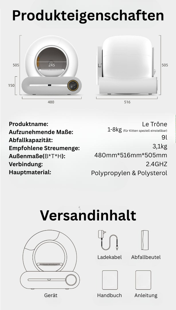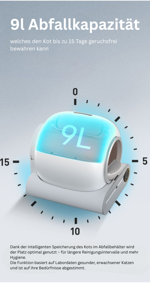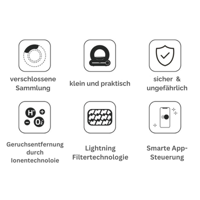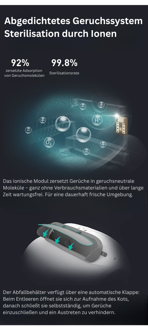 Der Abfallbehälter verfügt über eine automatische Klappe: Beim Entleeren öffnet sie sich zur Aufnahme des Kots, danach schließt sie selbstständig, um Gerüche einzuschließen und ein Austreten von strengen Gerüchen zu verhindern.