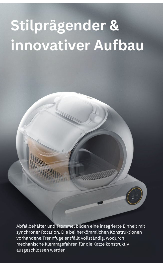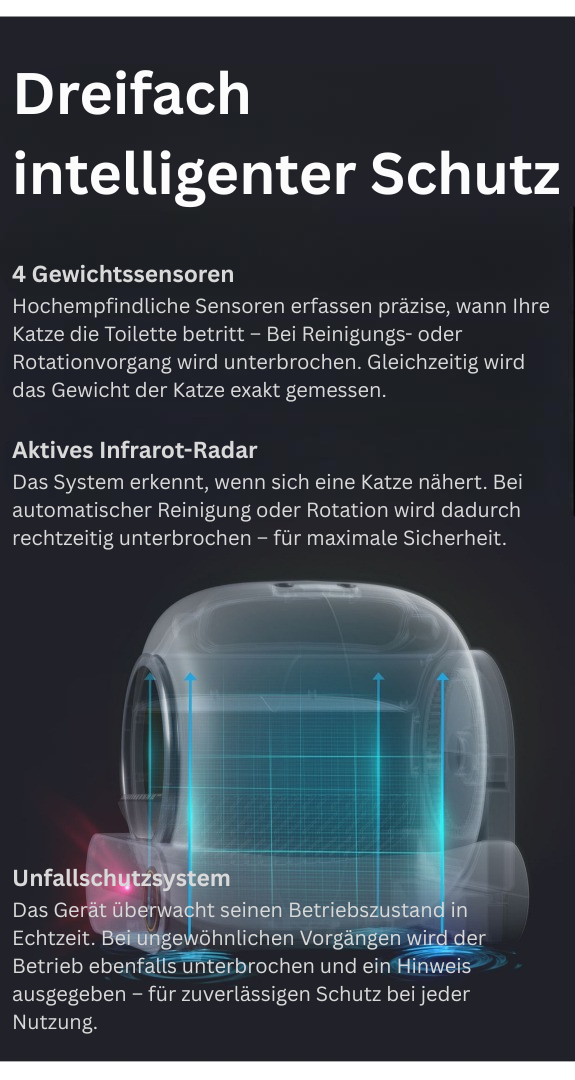 Sicherheit steht im Fokus: 4 Gewichtssensoren und ein Infrarot-Radar erkennen zuverlässig die Anwesenheit deiner Katze. Die Rotation stoppt sofort bei Annäherung – zudem wird ihr Gewicht überwacht. So ist der gesamte Prozess stabil, sicher und katzengerecht .