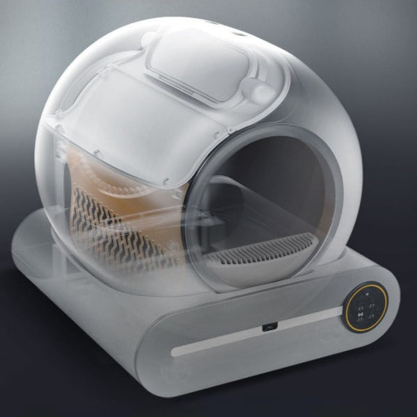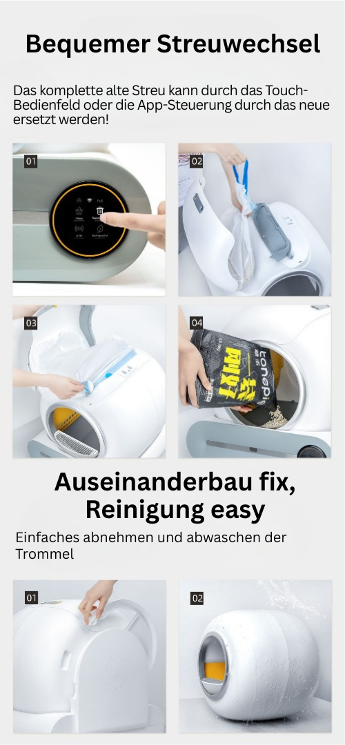 Die Trommel rotiert automatisch und transportiert alten Kot in einen geschlossenen Abfallbehälter. Nach dem Entleeren schließt eine integrierte Klappe selbstständig, so dass Gerüche eingeschlossen bleiben – ganz ohne manuelle Entsorgung.